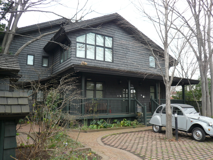 外壁、屋根共にカナダ杉の手割シェイク。サッシはマーヴィンの木製サッシ。濃いグリーンの色で仕上げている前面の木製デッキと、レンガ色のアプローチとのコントラストが美しい。