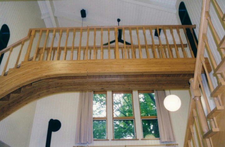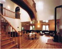 湾曲の集成材を使った橋。照明が天井から下がっている。両側の部屋をつなぐ橋は、吹き抜けの中で階段とクロスしている。 |
