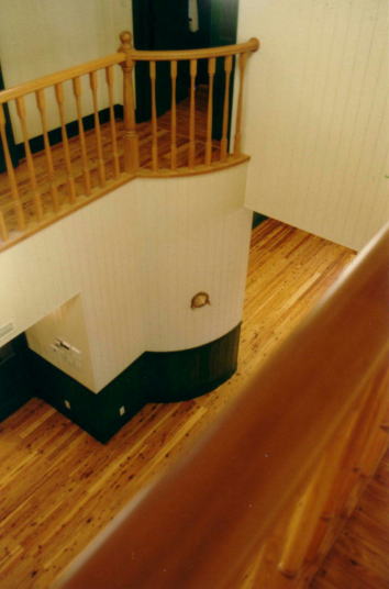 橋の上から下を覗いてみる。施主が、「子供が走り回ったり、橋を渡ったりする空間になれば、この建物は成功だ」と言っていた。実際子供だけでなく大人も渡りたがるので大成功だ。R型に膨らんでいるのはキッチンの納戸。船に使う丸窓が楽しい。誰もが覗きたがる。 |