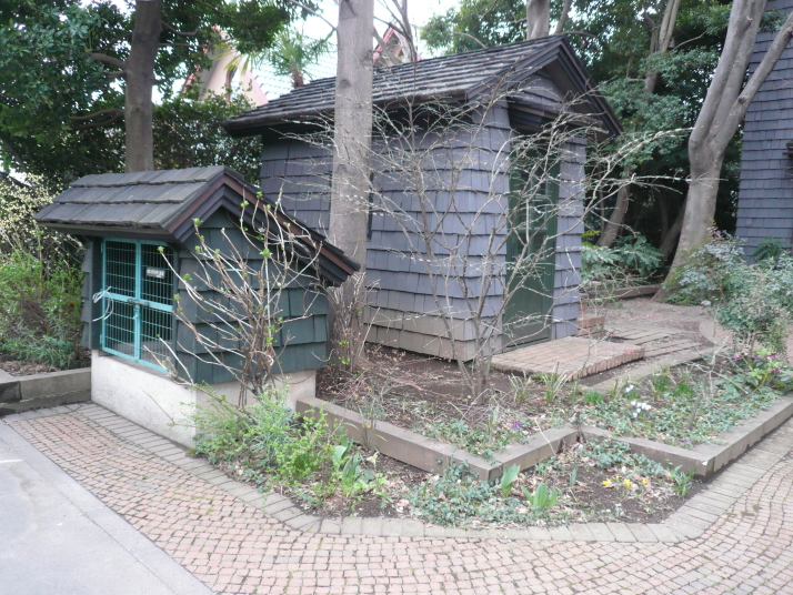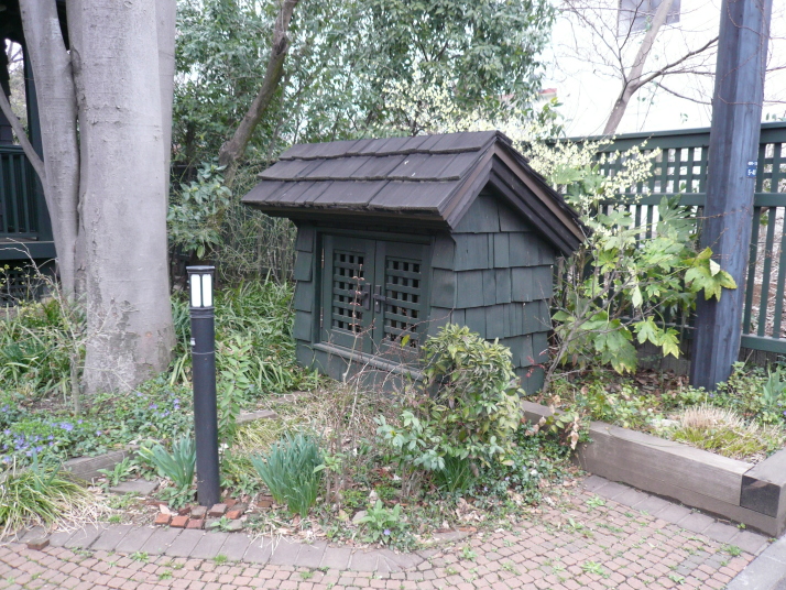 この中に電気メーター、ガスメーターが、収まってっている。右に見えるのは鉄骨の外側に木を張って化粧した引き込み電柱。 |