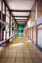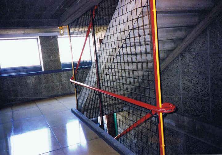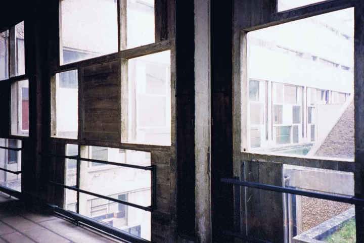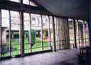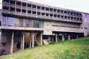 | リヨン郊外、ラ・トゥーレットの修道院。マンションなど、建物の一階に住居を作らず、駐車場スペースなどにする手法(ピロティ)を世に広めた建築家コルビジェの作品です。鉄筋の柱と床、階段を主要要素にすることで生まれる連続水平窓が美しい!フランス人の学生が、一人黙々と内部の構造をメジャーで測っていたのが印象的でした。 |