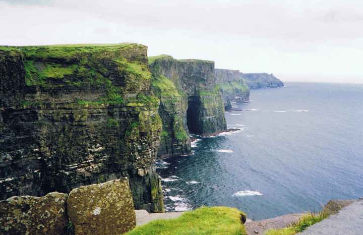 | ゴールウェイからモハーの断崖とバレン高原を巡る現地ツアーに参加しました。海面から200mの高さの断崖絶壁が8kmに渡って大西洋に突き出している。毎回集合時間を守らなかったイタリア人集団はついにこの断崖で置いてきぼりに、、、。 |
