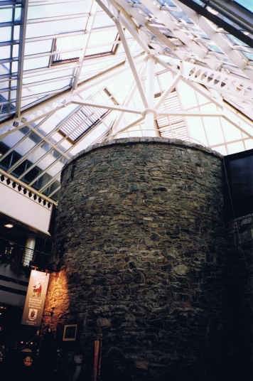 中世の壁や塔があるショッピングセンター。建設中に発掘されたそうです。 |