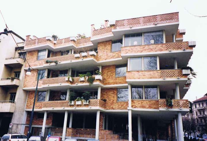 | わざと歪めた壁面と、レンガを1個おきに抜いて風抜きにしているバルコニーの壁がとても面白い。日本では考えられないような納まりです。 |