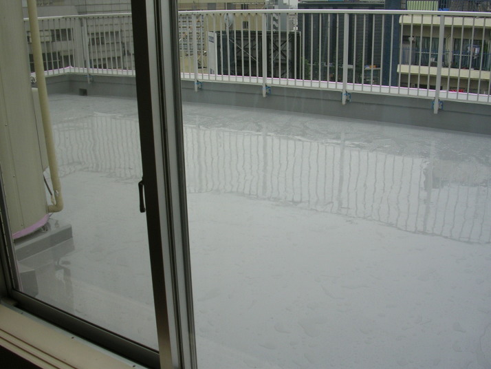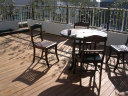全体にウリンの木製デッキを敷きつめ、周りにはプランターをおいて目隠しに利用。樹種はベンカナメモチ。東京のビル街の景色だが夜景が綺麗です。 |