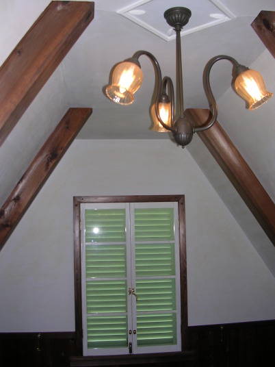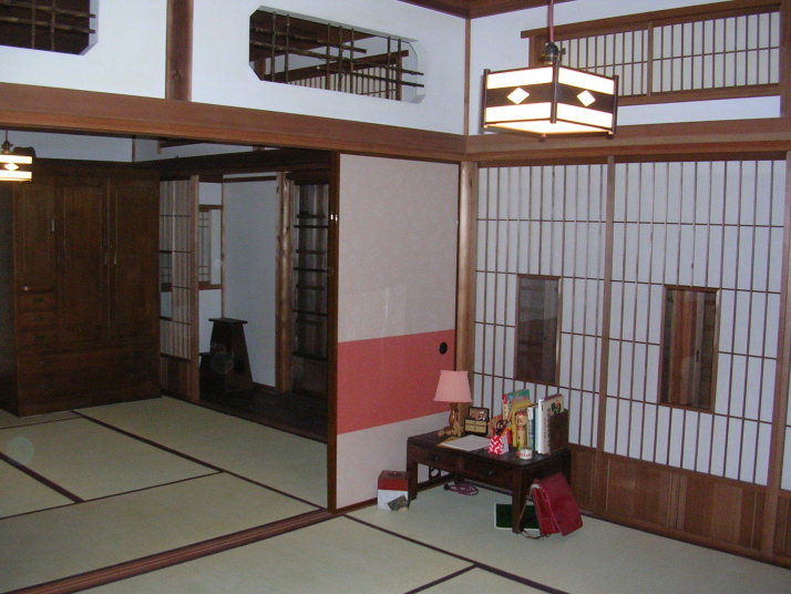 公開されなかった二階。壁の板には、穴が開いていて指を入れると黒くなる。(真っ黒クロスケの仕業) これはあまり知られていない仕掛けである。サツキちゃんが開ける窓は、当時の収まりを再現するのに明治村の建物を参考にしました。 |