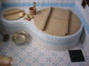 鋳物で作られた浴槽は長州風呂と呼ばれ、昭和初期には既にこのようなタイル貼り浴槽を造っていた家があった。残念ながら現在はリフォームされている。この風呂はもちろん実際に使用でき、我々も入りました。 |