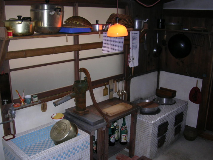 こちらも実際に使用できる釜戸や井戸ポンプ。窓のガラスや照明、家財道具も全て当時の物。このかまどで炊いたご飯はとても美味しかったです。 |