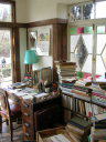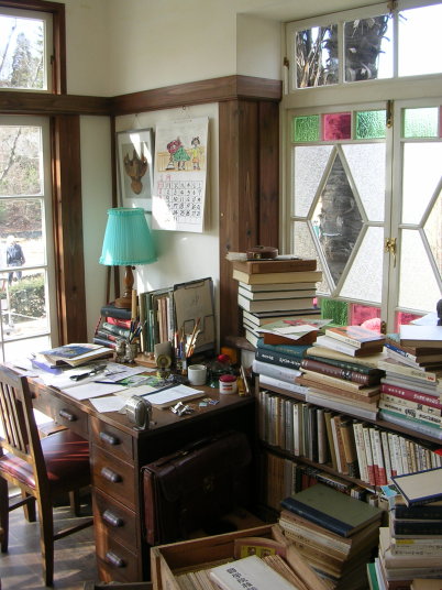 考古学者であるお父さんの部屋は、当時の本や標本で溢れている。出窓にも当時のステンドグラスをイメージして作られたであろう窓が入っている。大工さんが洋間として仕上げることに苦労しました。 |