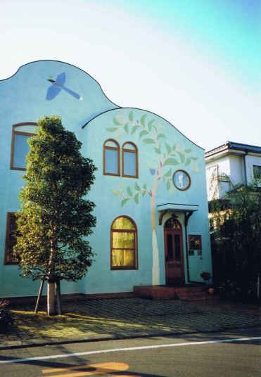 看板建築風の外観。絵は珠藻土を使ってコテで描かれている。珪藻土なので淡い色が綺麗。窓はマーヴィンの木製サッシ。丸窓がポイントになっている。 |