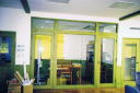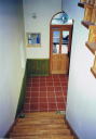 床のテラコッタタイルと緑色の腰板、木製の階段とドアで、このような暖かい色合いの事務所に仕上がった。 |